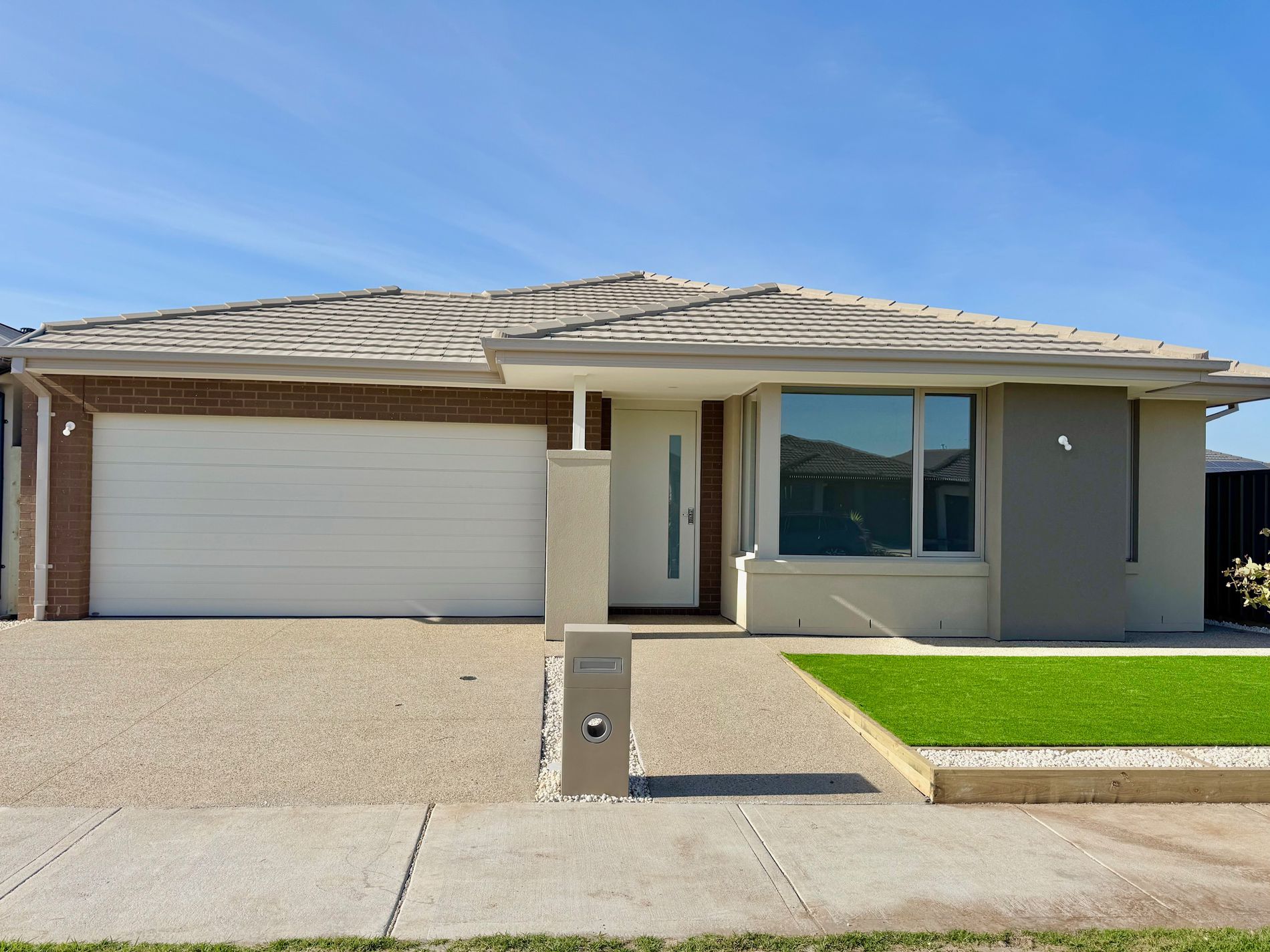 The exposed aggregate driveway and neat concrete pathways along both sides of the home ensure easy, low‑maintenance access.